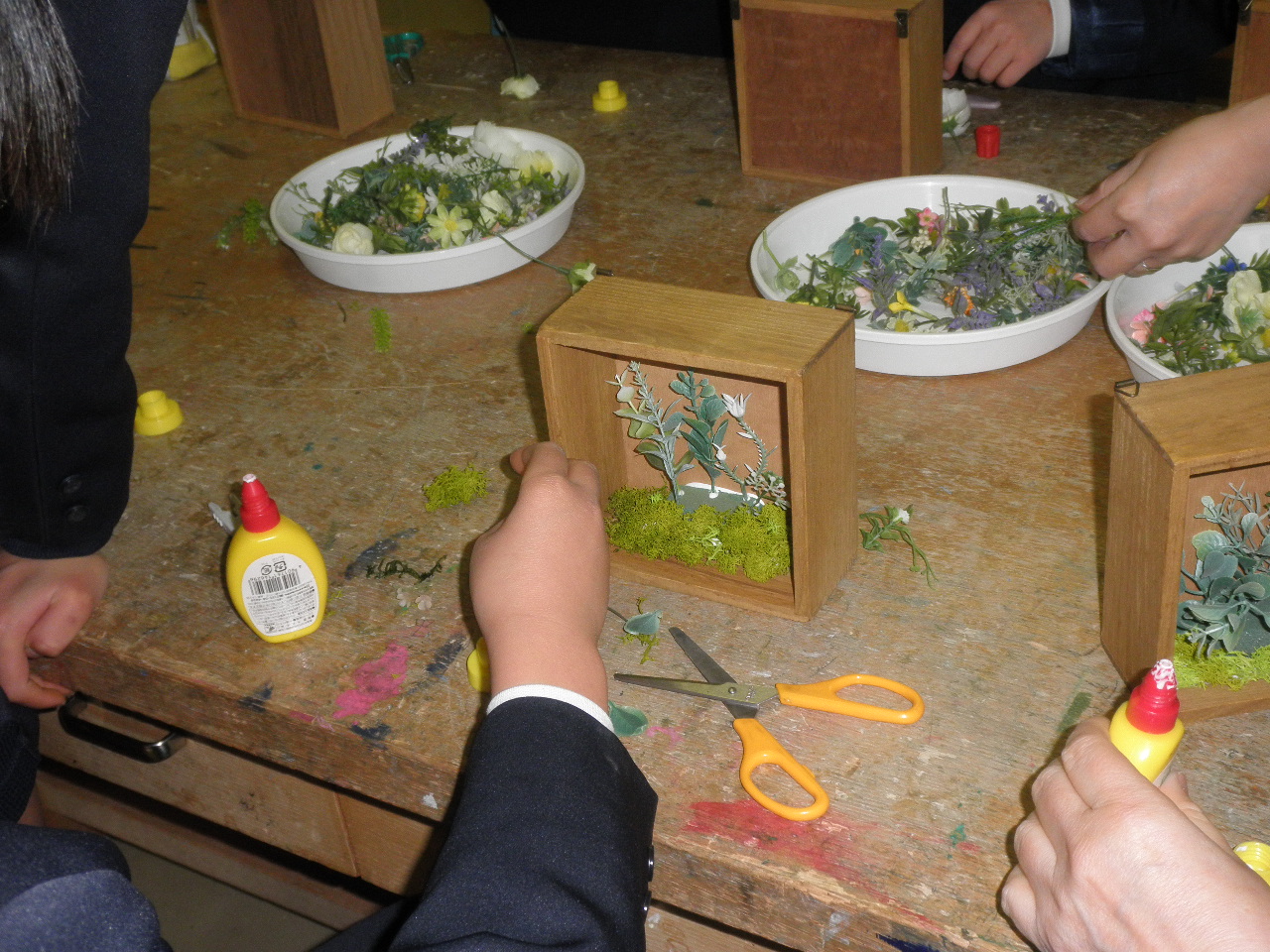 もの作りクラブの子どもたちが,造花を使って壁掛けを作っていました。町内のお花屋さんの方にゲストティーチャーとしてご指導いただきました。