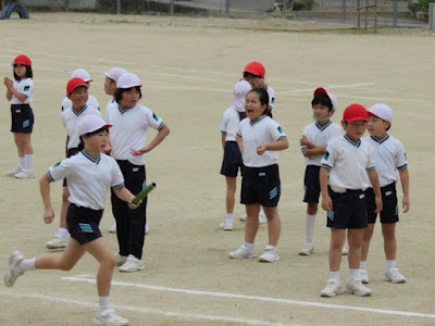 バトンパスの練習をした後、実際に走っていました。バトンパスが上手になってきています。大きな声でしっかり応援も頑張っていました。この後、雨が降り出しました。